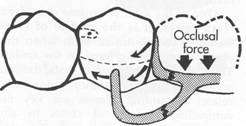 Fig. 7-51 Bar retainer is used on anterior abutment of modification space, and its terminus engages distobuccal undercut. Denture is designed to rotate around terminal abutments when force is directed toward basal seat on left. Such.rotation vvould impart force on right premolar directed superiorly and anteriorly. However, this direction of force is resisted in great part by mesial contact with canine. Direct retainer on right premolar engaging mesiobuccal undercut would tend to force tooth superiorly and posteriorly. |