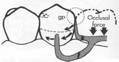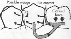 " Fig. 7-58 A, Clasp assembly designed so that vertical occlusal force results in proximal plate moving cendcally and out of contact with guiding plane as illustrated in B. This lack of contact may contribute to possible wedging effect. C, Extending contact of proximal plate on prepared guiding plane or, as in D, eliminating space between arti ficial tooth and guiding plane (gpJ will help direct stresses around arch through proximal contacts |