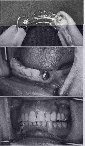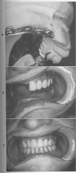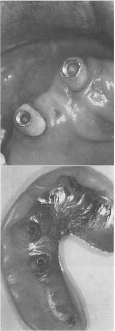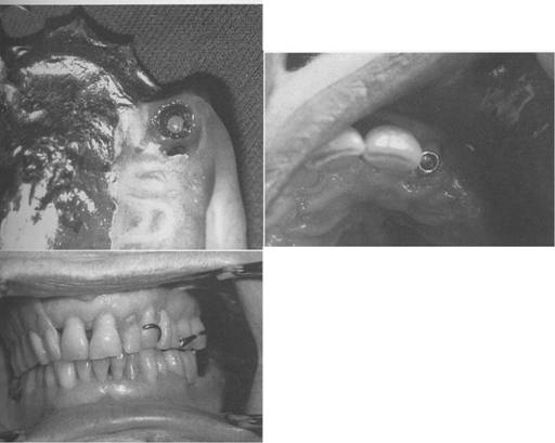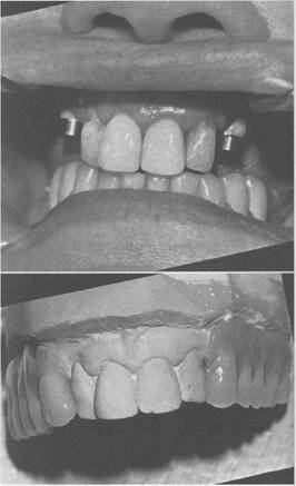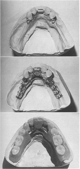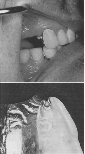 Fig. 7-63 Extracoronal spring-loaded plunger retaining device (Hannes Anchor/IC plunger). Permits full range of motion. A, Male plunger fits into dimple or female recess in porcelain-fused-to-metal crown located below height of contour on proximal surface of left central incisor. Band C, Acceptable retention and esthetics achieved if sufficient space is available. |