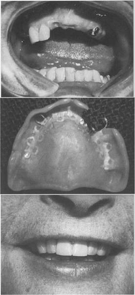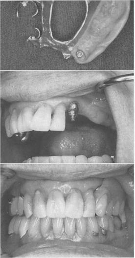 Fig. 7-60 A, Intracoronal retaining device (Zest Anchor) consistiIlg of nylon male post secured to denture base. B, Female insert cemented in dowel space of clinical root. C, Esthetic result. |