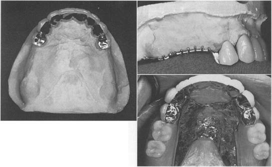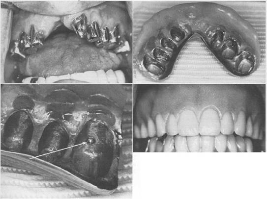 Fig. 7-70 Long copings on prepared natural abutments can provide support and retention in compromised dentition. A, Patient is adult with repaired Class IV cleft with resultant cross-bite, Class III occlusion, and severe anterior occlusal deficit. H, Internal surface of prosthesis fabricated to restore the arch. C, View of the internal overdenture structure with an IC attachment (arrow) that engages a dimpled crown preparation. Several such copings are placed to enhance retention. D, Labial view of completed overdenture prosthesis. |
