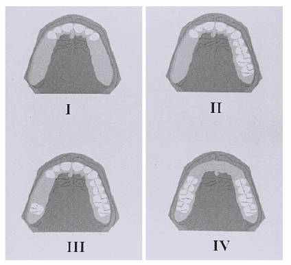 Figure 22-1: Kennedy classification. Kennedy Class I, bilateral distal extension; Kennedy Class II, unilateral distal extension; Kennedy Class III, unilateral edentulous area bounded by natural teeth; and Class IV, single bilateral (crossing the midline) area located anterior to the remaining natural teeth.