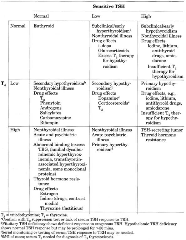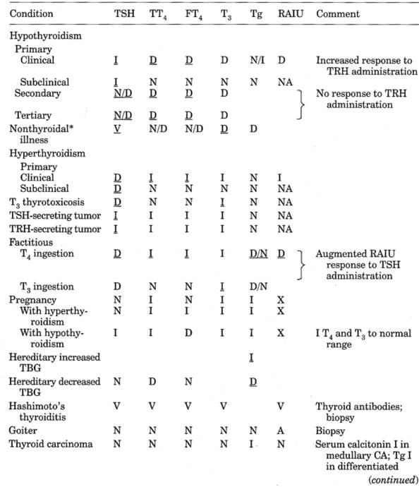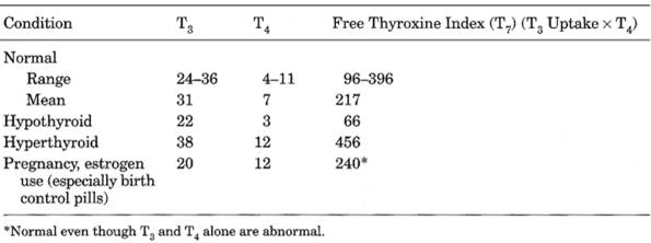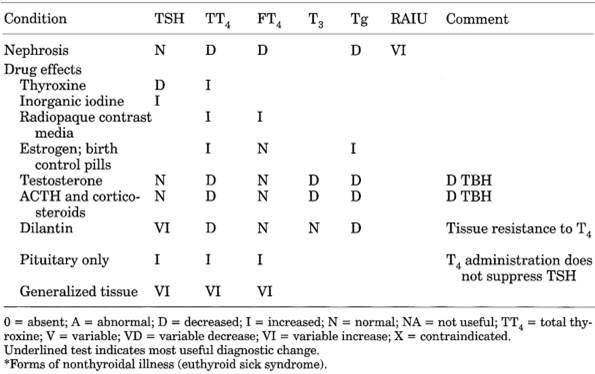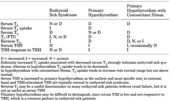 illness, tendency is for fall in total T and TBG with increase of free T4. Thus T uptake increases, and FTI tend to remain normal. A strong
