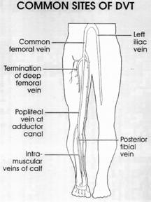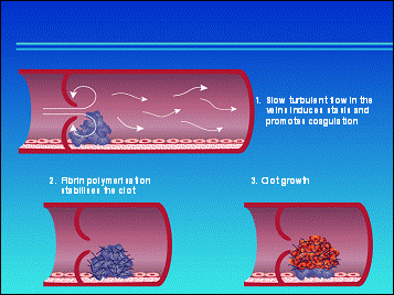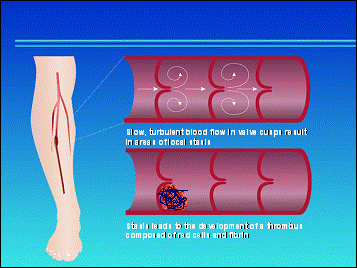 Venous thrombosis is usually the result of blood stasis. This explains why venous thrombi mostly form in regions of slow or disturbed blood flow, typically the deep veins of the legs where blood flow is slowest. This is deep-vein thrombosis (DVT).