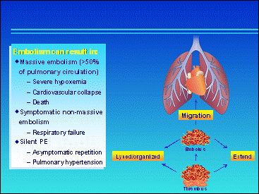 The main danger is that part of the thrombus, or the thrombus as a whole, may become detached from the vein lining to form an embolus that migrates in the circulation and can be swept into the lung artery causing lung infarction. This is pulmonary embolism (PE). Large emboli can cause massive blockage of the pulmonary circulation and can lead rapidly to dramatic symptoms and death.