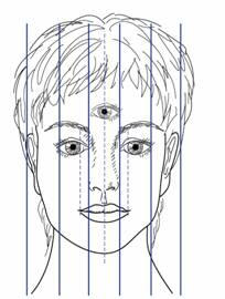 Figure 26-2: Frontal view of the face. Sagittal division of the face into fifths with each fifth equal to one eye width.