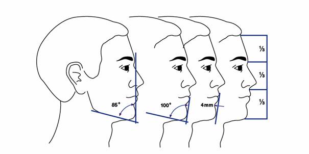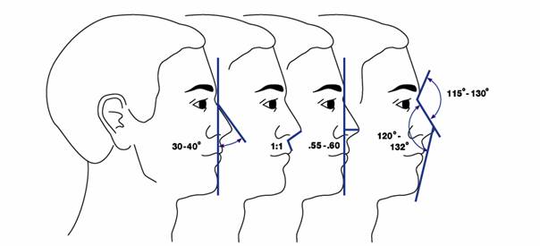 (30-40 degrees), and a nasomental angle (120-132 degrees). Using a vertical