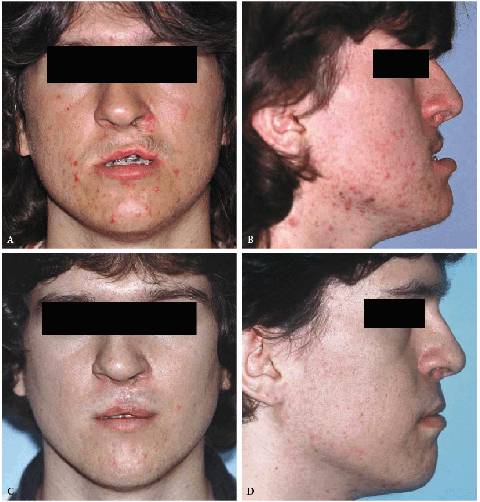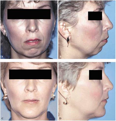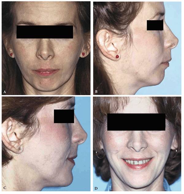 Figure 26-20A to D: (A) Preoperative frontal view of patient with chin deficiency. (B) Preoperative profile appearance. (C) Postoperative appearance following advancement of the chin with sliding horizontal osteotomy and chin implant placed over advanced chin. (D) Postoperative profile appearance.