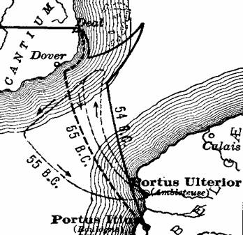 (Portus Itius), and landed at Deal, a few miles northeast of Dover.