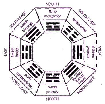 By looking at the Pakua above, notice what all the Life Aspirations reflect. For more detail of their symbolism, you need to check the following sections in the text. However, if you are already clear that perhaps your Career or Studies need working on, then notice which sector of your home they occupy or even which sector of a room represents these Life Aspirations.