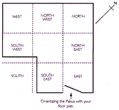 With another colour pen, divide up the floorplan into the 9 grids which the Pakua represents. If there is an extension on the property that takes up more than 50% of that side of the building, then include it within the Pakua. This will leave you then with an empty space outside of the home but which is technically to be included within the Pakua above. Small extensions of less than 50% of the side of a building or room, you can exclude from the Pakua.