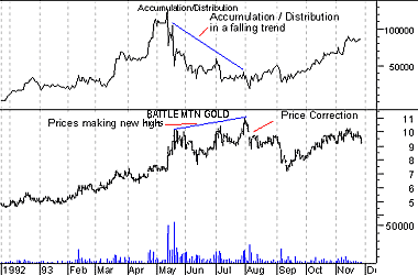 Divergences between the Accumulation/Distribution and the security's price imply a change is imminent. When a divergence does occur, prices usually change to confirm the Accumulation/Distribution. For example, if the indicator is moving up and the security's price is going down, prices will probably reverse.