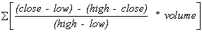 A portion of each day's volume is added or subtracted from a cumulative total. The nearer the closing price is to the high for the day, the more volume added to the cumulative total. The nearer the closing price is to the low for the day, the more volume subtracted from the cumulative total. If the close is exactly between the high and low prices, nothing is added to the cumulative total.