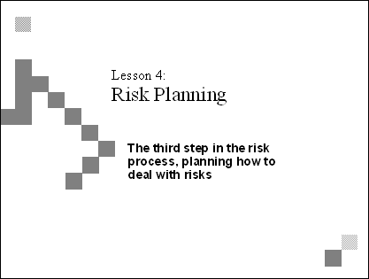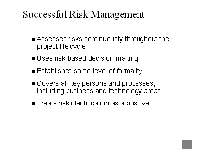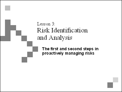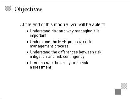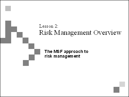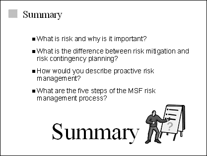 Explain MSF risk management is an ongoing five-step process that should be part of all project management. The key to its success is keeping it simple. Emphasize Although the "identify" step looks like a one-time event in the process, it is actually ongoing. Transition The next three lessons examine the steps in the proactive risk management process in detail. |