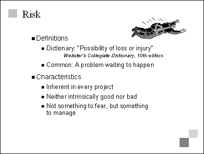 Explain Risk is the possibility of suffering a loss. For any given project, the loss could be such things as diminished quality of the end product, increased cost, missed deadlines, or failure of the whole project. Emphasize Risk is not inherently bad. But risk is inherent in every project. |