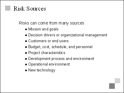 Explain The slide lists some examples of where risks might originate. The list is not exhaustive. Emphasize Risk can be found everywhere in an IT project. Poorly thought-out planning can be a source of risk, as can a shortage of money or people or a lack of training on new technology. Transition Make it clear that there is no one-to-one relationship between the list of sources on this slide and the list of possible consequences on the next slide. |