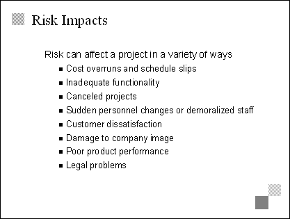 Explain These are examples of the types of impact that can result from risk. The list is not exhaustive. Emphasize Risks can affect a project in many different ways. To find them, you have to look beyond just cost. |