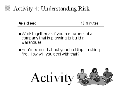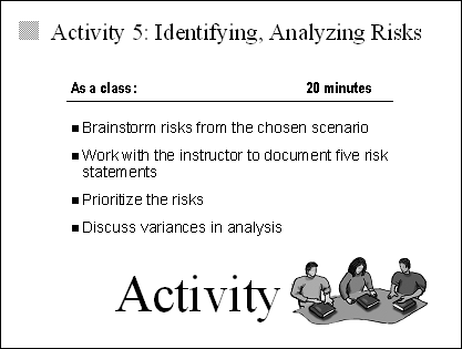 Prepare Read the instructions in the delivery guide for this module and on the slide. Facilitate Keeping the students in a large group, lead them through a brainstorming session to identify and document five risks from the chosen activity scenario and then to prioritize these risks. Debrief Finish the activity by engaging the students in a discussion about the variations in how they thought the risks should be assessed. |