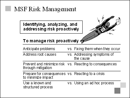Explain MSF risk management focuses on preventing risks ahead of time, whether by reducing their probability, minimizing their impact, transferring risks, or avoiding them altogether. Emphasize MSF risk management is very proactive, rather than reactive. |
