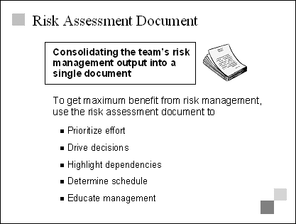 Explain The risk assessment document is the compilation of all of the risk assessment pieces. It is a living document that the team should review at every major milestone, at a minimum. |