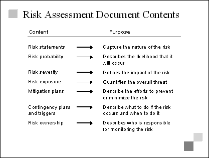 Explain The items on the slide do not necessarily represent all the things that the risk assessment document could contain, but they do represent those things that should be there at a minimum. For example, risks are often described using a risk statement approach, whereas other times they are described by separating risk causes from risk consequences. The contents of the risk assessment document should clearly explain what the project risks are, what is being done to prevent them, and what will be done if they occur. |