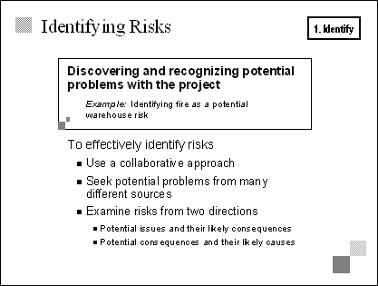 Explain Identifying risks is a crucial first step in the proactive risk management process because risks can't be managed until they've been identified. Emphasize Risk identification is not a one-time event. |