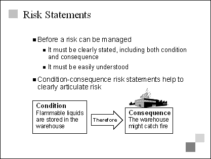 Explain MSF advocates using formal risk statements that state both the condition and the consequence of each risk in a clear and easily understood fashion. Emphasize Often team members identify only one side of the risk equation. It's important to make sure that they also identify the condition and the consequence. |