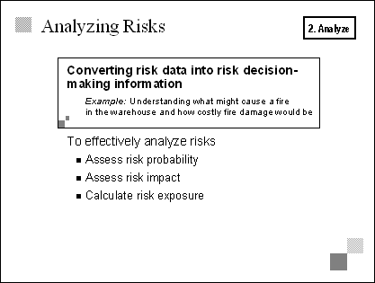 Explain Analyzing risks converts the raw risk data from the identification process into information the team can use to make decisions. Analysis helps the team focus on the right risks. It considers three factors: risk probability, risk impact, and risk exposure. Emphasize Analyzing risks allows the team to quantify risk priorities. Transition The next three slides examine those factors in more detail. |