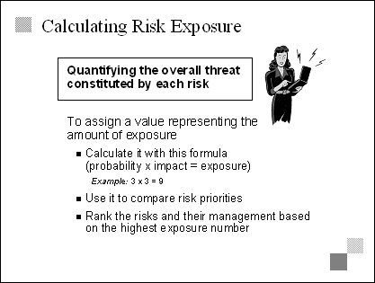 Explain Risk exposure is an artificial way of quantifying the overall threat of a risk. You calculate it by multiplying probability times impact. It has meaning only within the context of the project and by comparison with other risks. Emphasize Risk exposure is meaningful only in relationship to other risks that use the same scales. |