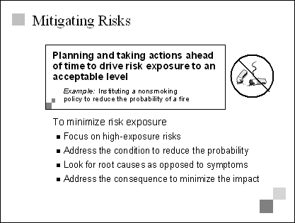 n Mitigating risk means taking steps ahead of time to keep a risk from occurring or driving its impact to an acceptable level.