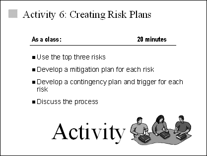 Prepare Make sure you have read the delivery guide for this module for background information on this activity. Facilitate Keep the students in a large group. Using the risks developed from the last activity, have the students select the top three risks and prepare a mitigation plan and a contingency plan-including triggers-for each risk. Debrief After you've gone through the proposed plans, lead the students in a discussion of their plans. |