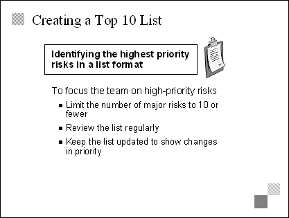 Explain The team can focus on only so many risks at one time. Using top 10 lists is a good way to focus efforts on a limited number of major issues. Emphasize The number of risks is not important of itself, although lists work best if they contain 10 or fewer risks. A top 10 list works only if the team reviews it regularly. |