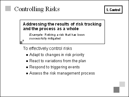 n Controlling risk is the step that enables the project team to react to the dynamics of the project situation.
