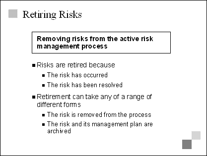 n One approach to retiring a risk is to archive the risk and its management plan (successful or otherwise) into a repository for use and reference by future projects.
