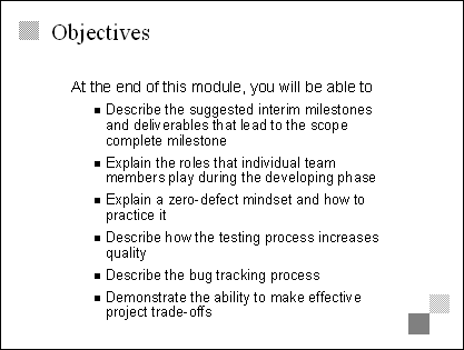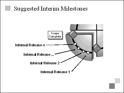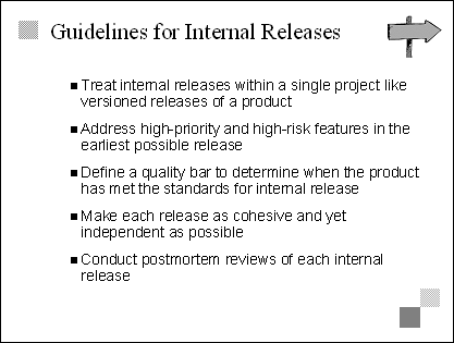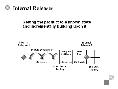 Explain Because the developing phase is all about building the product, the interim milestones measure the progress of that building. Developing is done in parallel and in segments, so the team needs a way to measure progress as a whole. Internal releases accomplish this by forcing the team to synchronize pieces at a product level. Emphasize Typically, internal releases are two to four months apart. The number and frequency of releases will depend on the size and duration of the project. Transition The next three slides offer more detail about internal releases, so avoid going into too much detail at this point. |