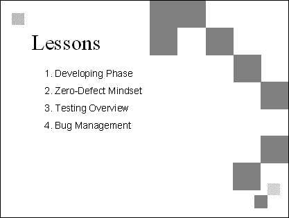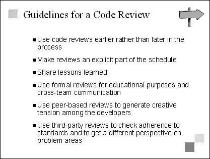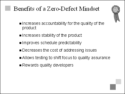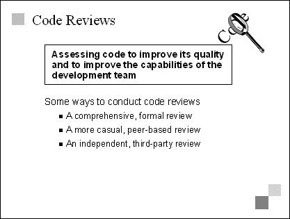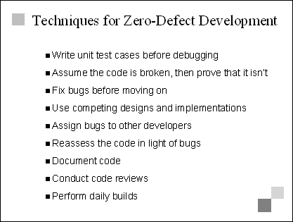 Explain This is a collection of specific techniques that contribute to a zero-defect mindset. We separated them from guidelines because they suggest specific things that teams can do, rather than just general approaches. Transition The last two bullets on this slide set up two especially important techniques-code reviews and daily builds. The next six slides examine those techniques in more detail. |