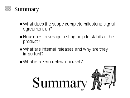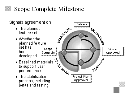 Explain At this point in the project, the team should have developed all features, but these features might not be stable. In other words, they might still have bugs. The product should be ready for the stabilizing phase, which means that there are no issues that could block testing. Emphasize This milestone offers customers, end users, operations and support personnel, and all other key project stakeholders the opportunity to identify any issues they want addressed before the product ships. Essentially, reaching this milestone means that no new code will be written. Only stabilization is left. |