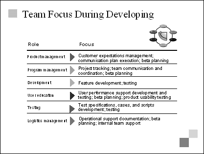 n &n 12212l1119m bsp; Development joins user education and testing in driving the developing phase, focusing on building the product described in the functional specification and working with testing to ensure product reliability from one internal release to another.