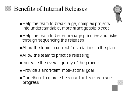 Explain The primary benefits of internal releases are that they make projects more understandable and more manageable and provide the team with early success. |