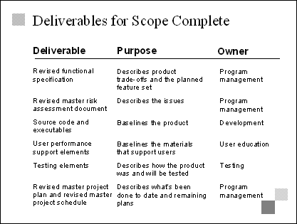 Explain The team might require other deliverables to achieve the scope complete milestone, depending on the nature and scope of the project, but these six are fundamental. They include a baseline of the product and the material to support user performance as well as the project documentation that is necessary to move forward. Emphasize This is by no means a comprehensive list, only a representative sampling. |