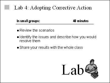 Prepare Review the materials about this lab in the delivery guide segment for this module. Facilitate Break the class into small groups of four to six persons. After the groups have completed the exercise, ask the designated spokesperson for each group to share his or her group's results. Debrief Ensure the students are using MSF tools to address the issues in the scenarios. They should be doing due diligence and understanding the risks involved through risk assessment and then using the project trade-off triangle to balance the variables again |