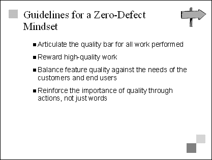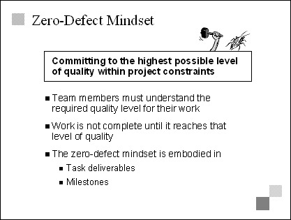 Explain The key to implementing a zero-defect mindset is to understand that all work requires a predefined quality bar and that no work can be considered complete until that quality bar is reached. Transition The last bullet on this slide, referring to the importance of actions, sets up the next slide, which offers techniques for achieving a zero-defect mindset. |