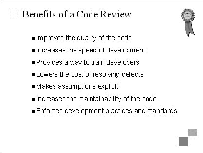 Explain The two important points for this slide are that code reviews improve quality-for the code and for the team developing it-and that they take different forms. Code reviews are tools that teach the team to use good coding techniques and to improve the coding itself. Transition Remember that the next two slides will examine benefits and guidelines for code reviews. |