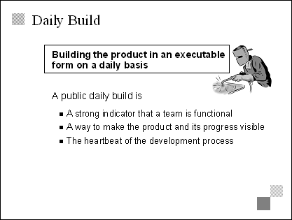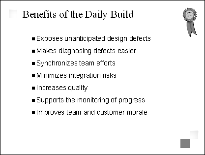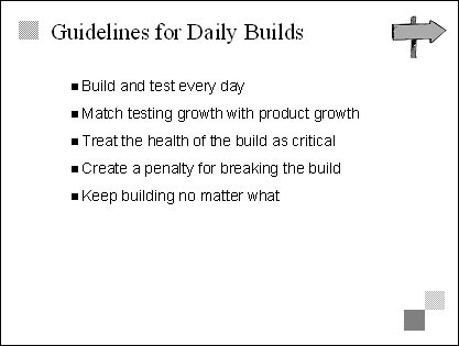 Explain The daily build is a fundamental principle at Microsoft. Although it can be difficult to implement, it provides great benefits. For more information on the daily build process, read the daily build process in Chapter 5, p. 263, in Microsoft Secrets, by Michael A. Cusumano and Richard W. Selby. Emphasize "It's easy to be delusional when you're creating software but, in the face of the daily build, much potential for fantasy is harmlessly discharged." Jim McCarthy, Dynamics of Software Development. Transition The next two slides discuss the benefits of and guidelines for implementing daily builds. |