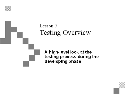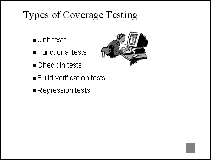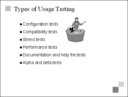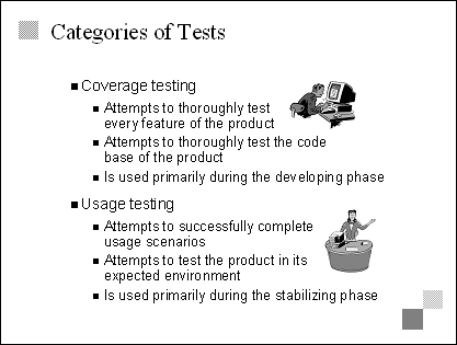 Explain Testing has two basic categories-coverage, which looks to see if a feature performs as specified, and usage, which looks to see if the product meets the needs of the customers and end users. Transition The next two slides describe coverage testing and usage testing in more detail. |
