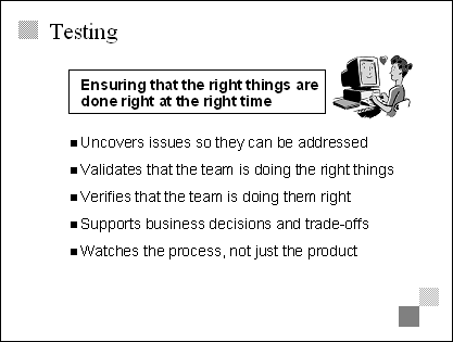 Explain Ultimately, the role of testing is not just to find bugs, but to assure quality. Because the ultimate definition of quality is meeting the customer's needs by solving the business problem, the testing process should support that by validating what needs to be done and verifying that it's being done correctly. Emphasize This slide, and the remaining slides in the lesson, are not about the testing role on the team, but rather about the role of the testing process in achieving quality. |