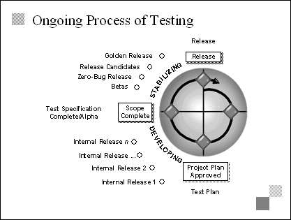 Explain The testing process is not limited to the stabilizing phase. It is an integral part of the developing process as well. We have already covered internal releases, and we will cover the stabilizing phase in the next module. |
