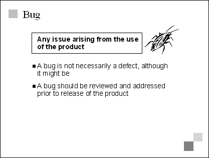 Explain Despite the widely held perception that all bugs are defects, they are not. Defects are a class of bug, but a bug is any issue that arises from using the product that is being developed. Emphasize A bug is anything that needs to be addressed and resolved before the product is released. |