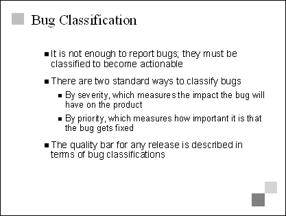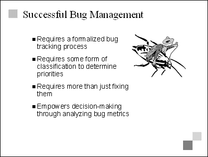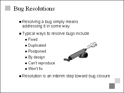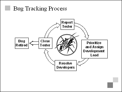 Explain Being determined to fix all bugs isn't enough. They have to be tracked and managed, so that the team is empowered to make necessary trade-off decisions during the stabilizing phase. Bug tracking processes encompass such issues as bug reporting, prioritization, assignment, resolution, and closure. Transition The next three slides examine bug tracking and bug classification in more detail, so avoid going too deep here. |