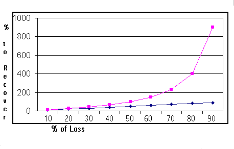 Figure 1. Percent loss (drawdown) vs. percent to recover. Notice that the percent to recover (top line) grows at a geometric rate as the percent loss increases. This illustrates the difficulty of recovering from a loss and why money management is so important. |